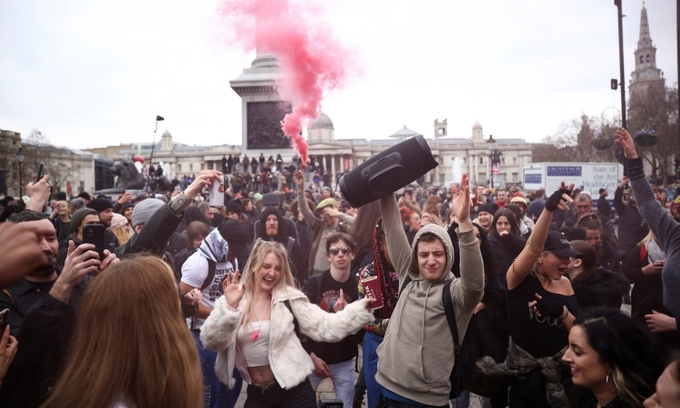 Người dân nhảy nhót, đốt pháo sáng khi biểu tình chống phong tỏa ở London, Anh, hôm 20/3. Ảnh: Reuters.
