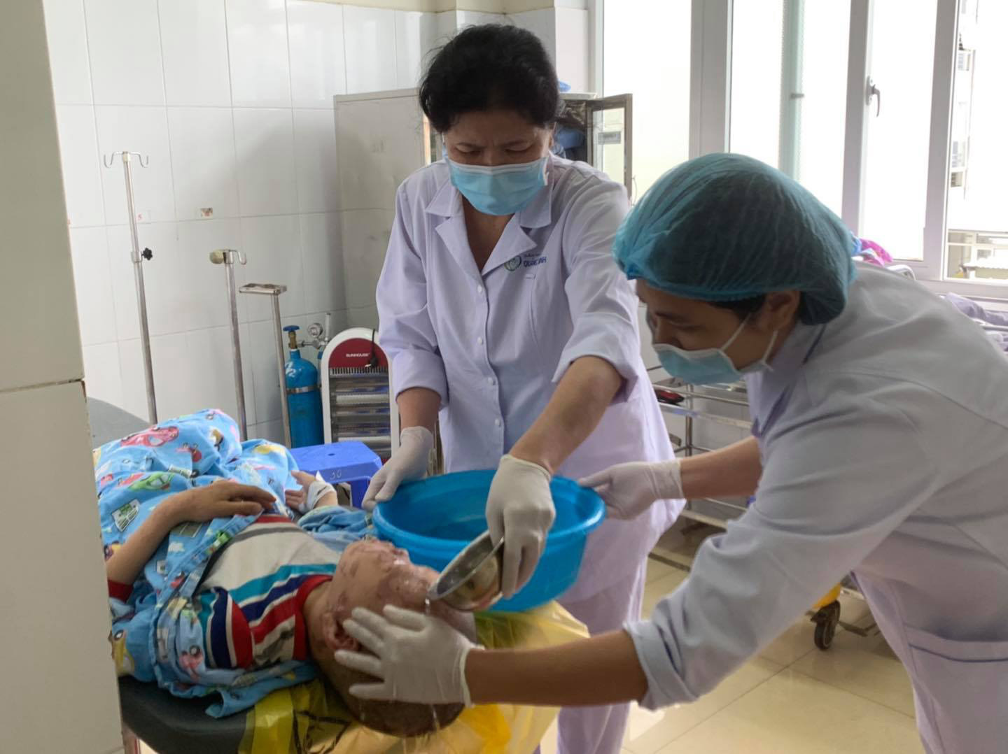Các nhân viên y tế điều trị bỏng cho bệnh nhi.