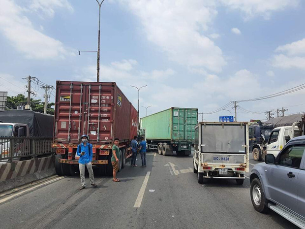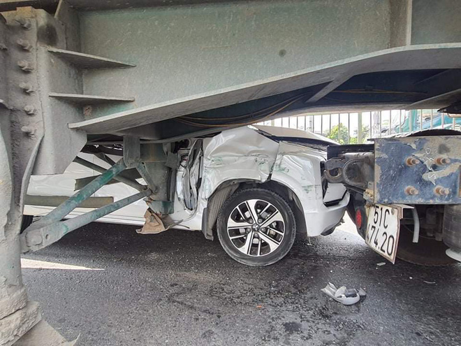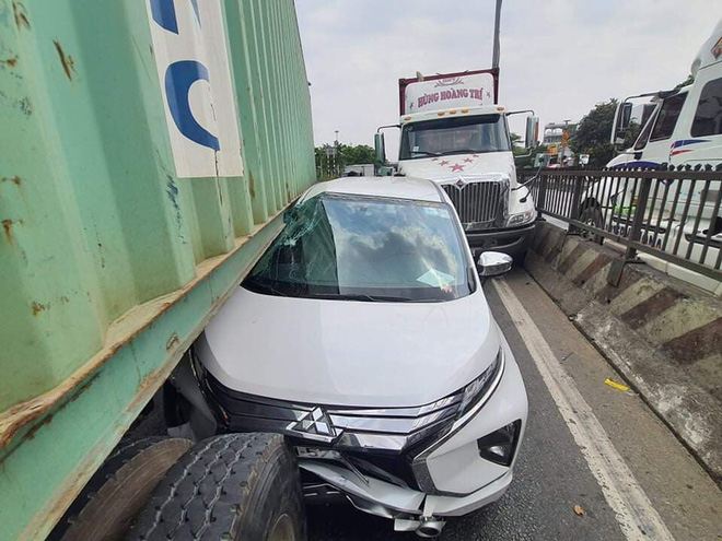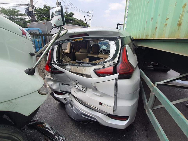 Tuy nhiên lúc này, ô tô 7 chỗ bị một xe container khác (BKS: 51C-784.44) lưu thông cùng chiều phía sau va chạm.