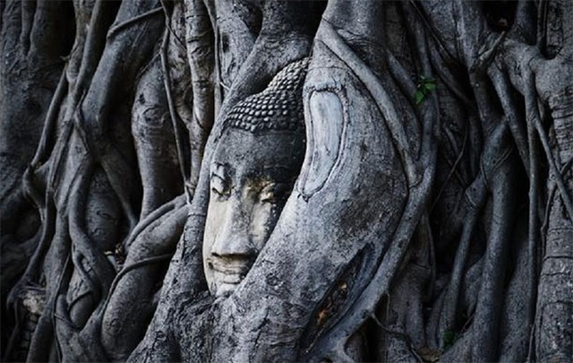 Pho tượng Phật được rễ cây ôm trọn ở một ngôi chùa tại Thái Lan. (Ảnh: Travel).