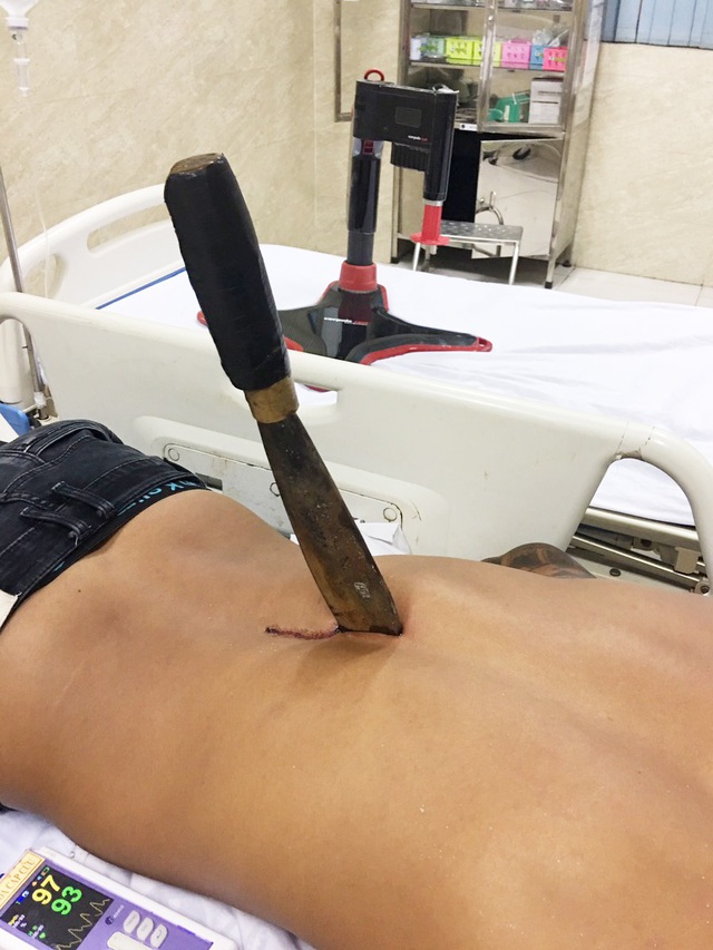 Nạn nhân được chuyển đến bệnh viện cấp cứu với con dao bầu cắm trên lưng.