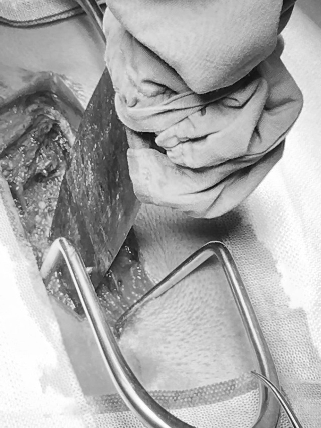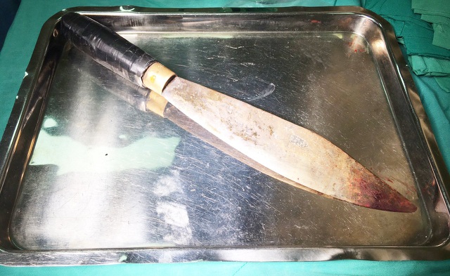 Con dao bầu có lưỡi dài 30cm được rút ra khỏi cơ thể bệnh nhân.