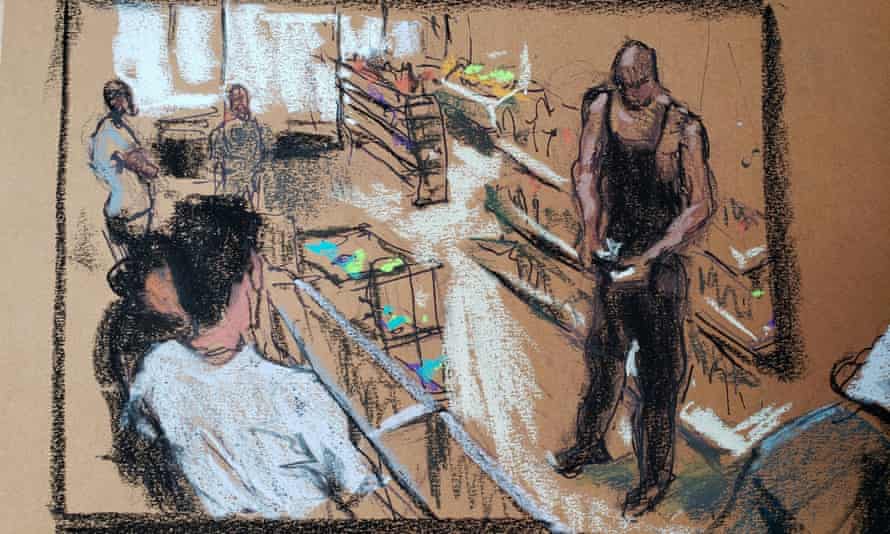 Hình vẽ tay minh họa cho đoạn video được chiếu trước tòa, cho thấy cảnh George Floyd đang đếm tiền để trả cho tiệm. Ảnh: Reuters.
