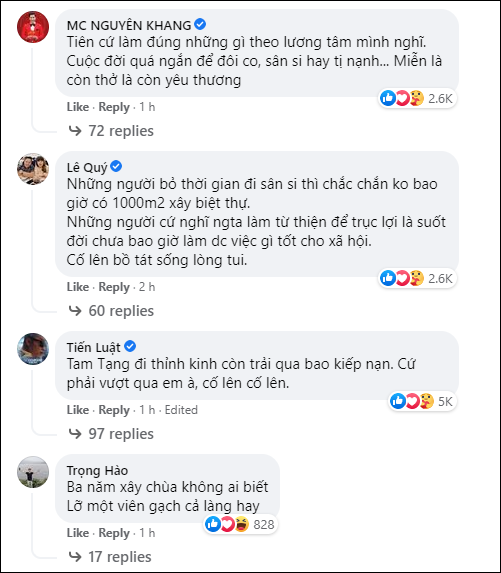 MC Nguyên Khang bình luận: “Tiên cứ làm đúng những gì theo lương tâm mình nghĩ. Cuộc đời quá ngắn để đôi co, sân si hay tị nạnh. Miễn là còn thở là còn yêu thương”.