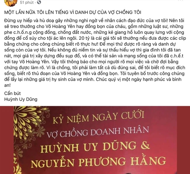 Vậy tôi thông báo cho mọi người rõ mọi việc và chờ đợi mọi thứ được làm rõ. Vì là chồng, tôi phải làm tất cả dù đúng sai, để tôi biết rõ mục đích sống, biết rõ thủ đoạn của Võ Hoàng Yên và đồng bọn. Tôi tuyên bố trước công chúng để lấy lại những giá trị hy sinh của vợ mình", ông chủ khu du lịch nổi tiếng viết trên trang cá nhân.