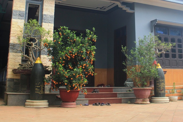 Hiện trước cổng nhà anh Hạnh trưng bày một số quả bom, đạn đã được anh phục chế rất đẹp mắt.