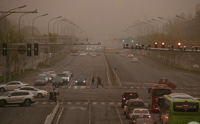 Toàn thành phố Bắc Kinh chìm trong cát bụi, tầm nhìn hạn chế khiến các phương tiện giao thông phải bật đèn khi lưu hành trên đường.