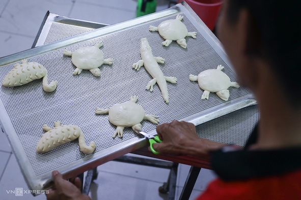 Những ổ bánh mì cá sấu sau khi nhào nặn được thợ dùng dao lam, kéo... rạch các đường để tạo lớp vảy. Trung bình mất 4 phút để xong một hình bánh mì thú loại nhỏ.