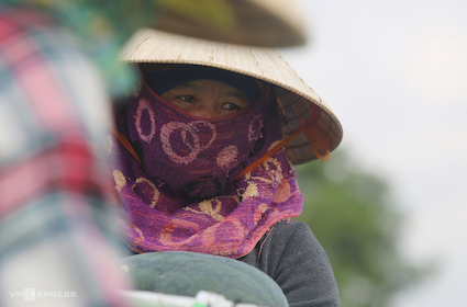 Bà Thanh ở xã Tam Phước đội nón lá, bịt khăn để tránh nắng nóng 35 độ C khi thu hoạch dưa.