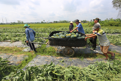 Người dân đứng thành hàng, chuyền tay nhau đưa dưa lên xe kéo. Mỗi sào dưa, nông dân đầu tư trung bình 2 triệu đồng, đạt năng suất từ 1,7 đến 2 tấn. Với giá bán 4.500 đồng mỗi kg, trừ chi phí lãi được 6 triệu đồng.