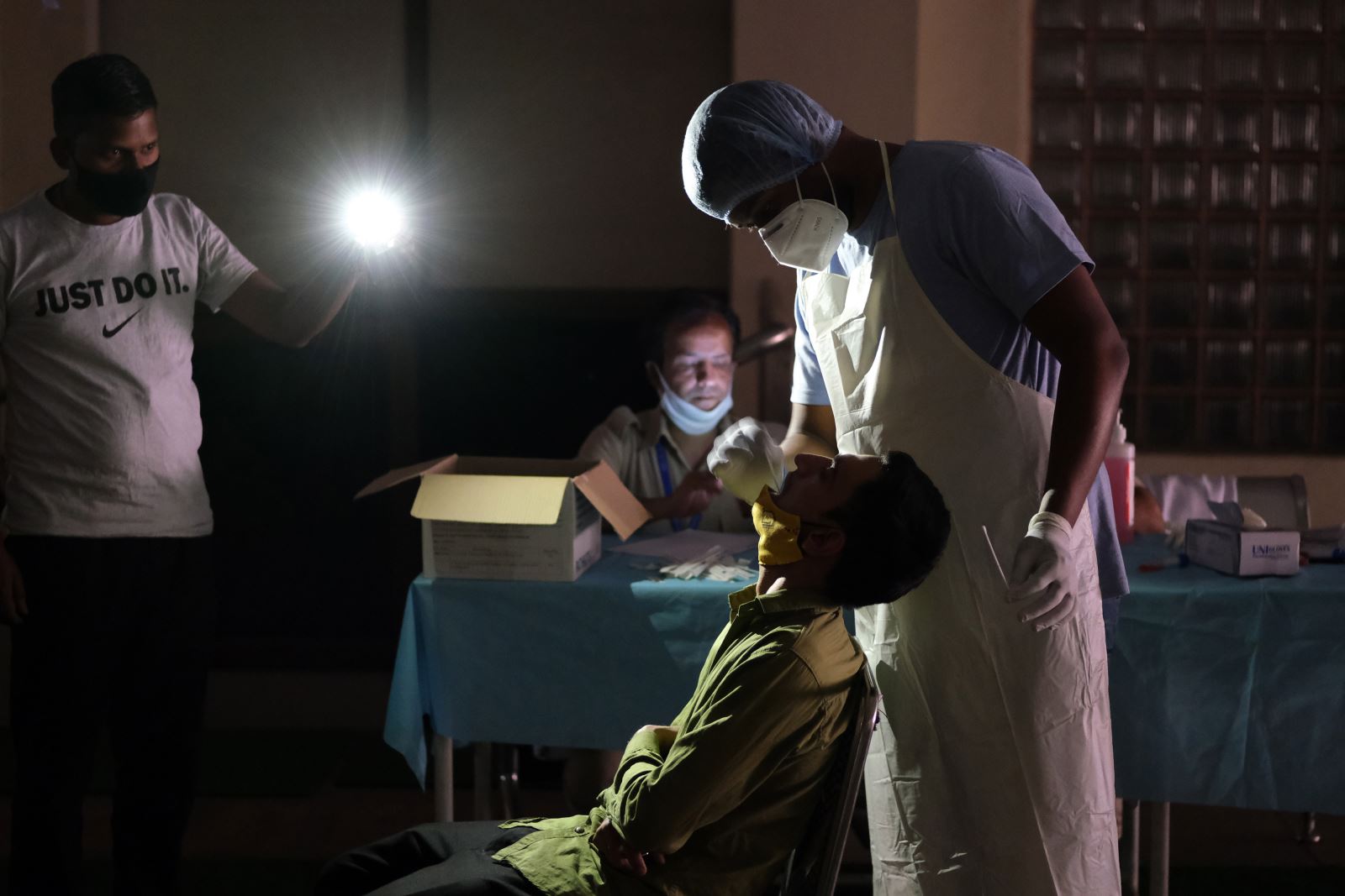 Lấy mẫu xét nghiệm COVID-19 trong ánh đèn điện thoại tại sân vận động Jawahar Lal Nehru Stadium ở New Delhi. Ảnh: Bloomberg