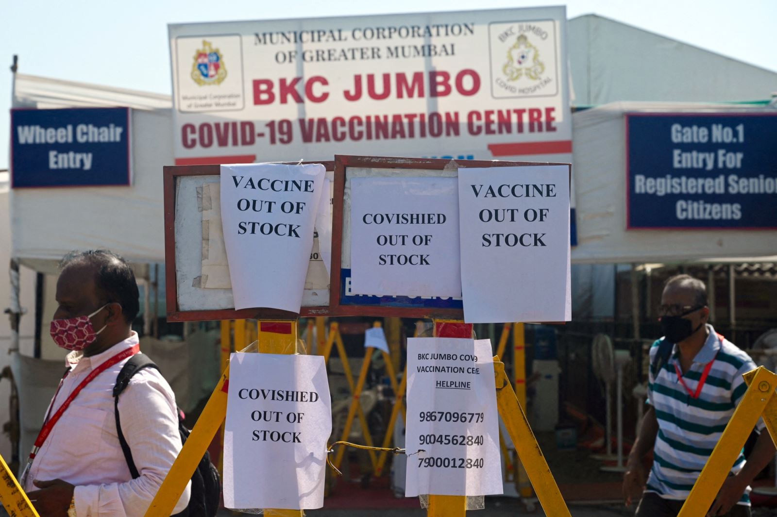 Thông báo hết vaccine COVID-19 và tấm che mặt ở Mumbai. Ảnh: AFP