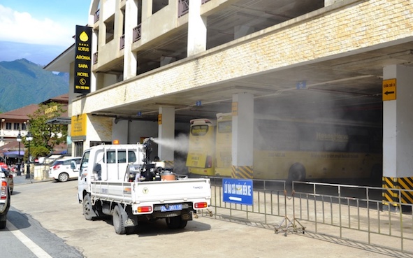 Bên cạnh đó, Đội công tác tiến hành phun khử khuẩn bến xe, chợ và các tuyến phố chính, tập trung đông nhà hàng, khách sạn, dân cư như: Cầu Mây, Xuân Viên, Thạch Sơn, khu vực cáp treo Fansipan… Đặc biệt, Đội công tác tập trung phun kỹ các cơ sở đang bị phong tỏa là khách sạn Pao’s và các khu cách ly tập trung ở địa bàn thị xã Sa Pa.