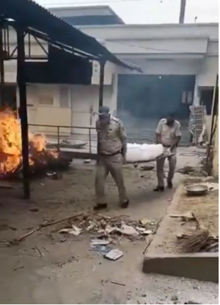 Cảnh sát viên Rakesh Kumar cùng đồng đội khiêng thi thể từ xe cứu thương vào nhà hỏa táng. Ảnh: Twitter/Delhi Police.