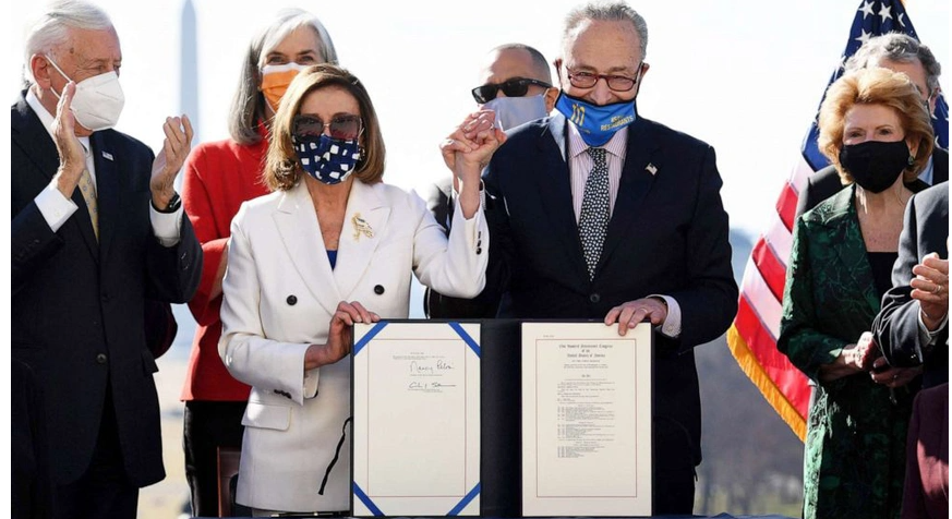 Lãnh đạo phe Dân chủ tại Quốc hội Mỹ công bố gói cứu trợ 1.900 tỷ USD hồi tháng 3. Ảnh: CNBC.