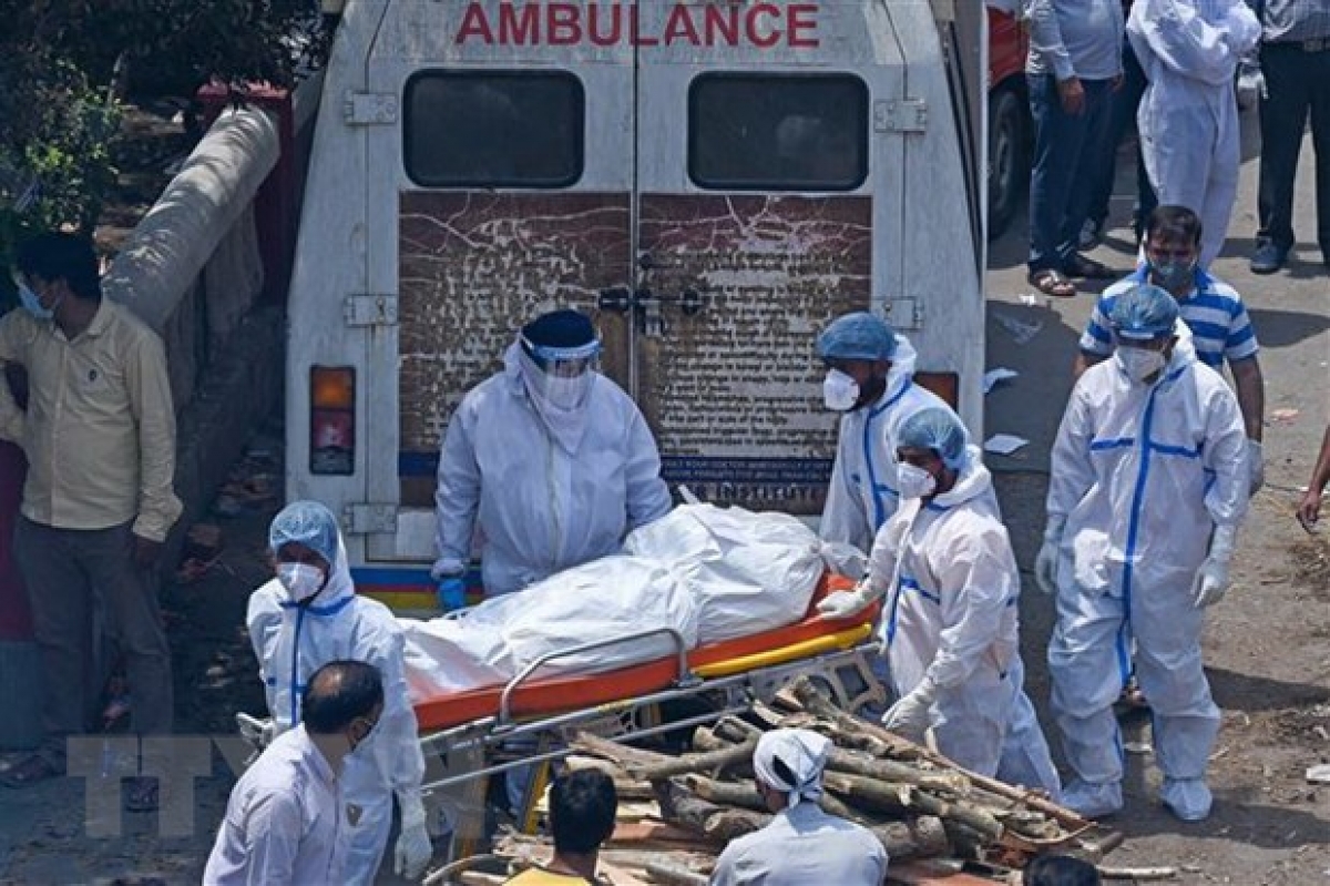 Nhân viên y tế chuyển thi thể bệnh nhân COVID-19 tới khu hỏa táng ở New Delhi, Ấn Độ. (Ảnh: AFP/TTXVN).