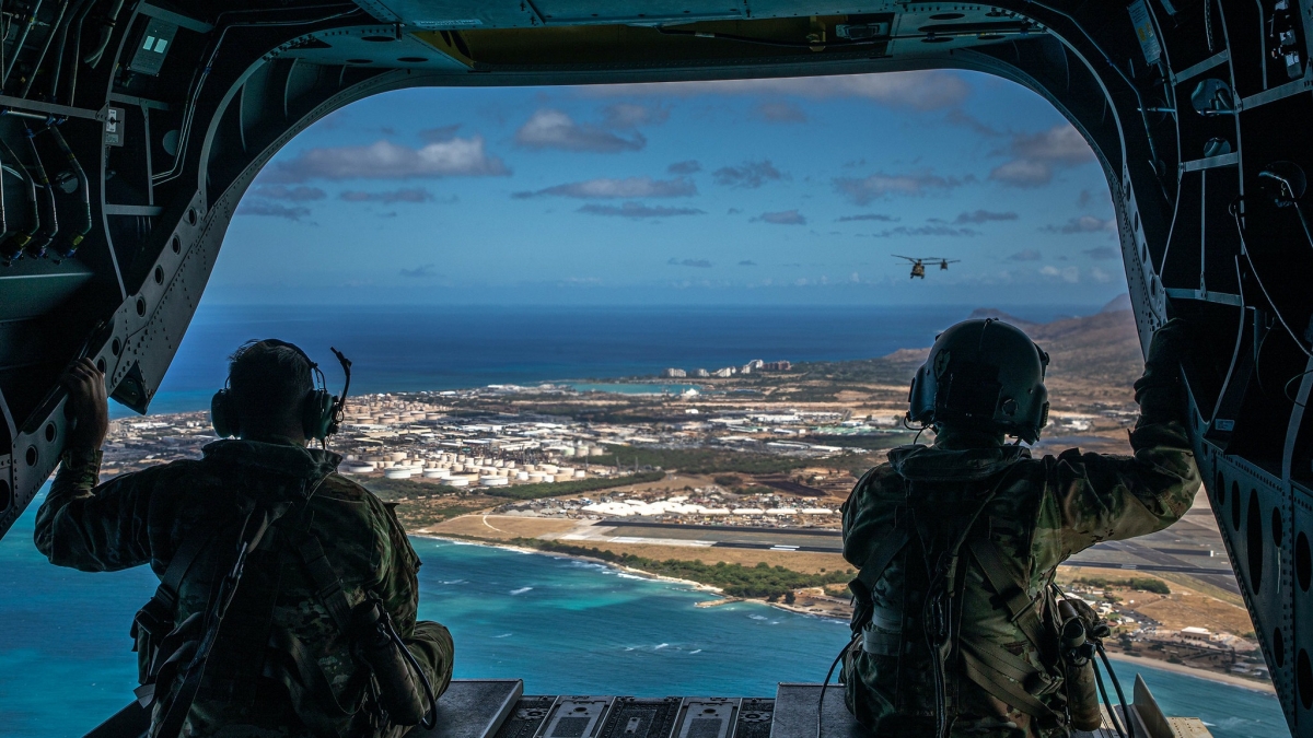 Binh sỹ Mỹ trên trực thăng CH-47F Chinook nhìn xuống quần đảo Hawaii. Ảnh: Lục quân Mỹ