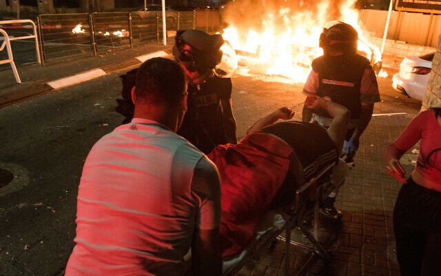 Lực lượng an ninh và nhân viên y tế Israel đưa một người đàn ông bị thương đi cấp cứu sau vụ đụng độ giữa người Ả rập và Do Thái ở thành phố Acre hôm 12/5 (Ảnh: Times of Israel).