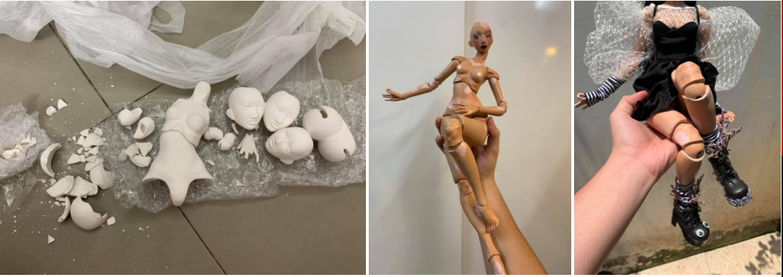 Các phần cơ thể của búp bê được làm rời rạc, đem nung rồi ghép lại nhờ những khớp và dây nối. Trang phục, phụ kiện do Đa tự thiết kế.