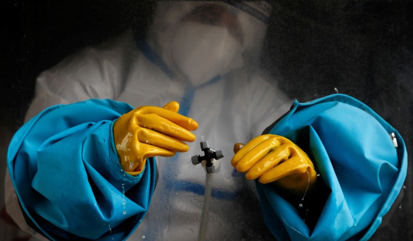 Một nhân viên y tế rửa găng tay tẩy rửa găng tay trước khi làm xét nghiệm PCR.