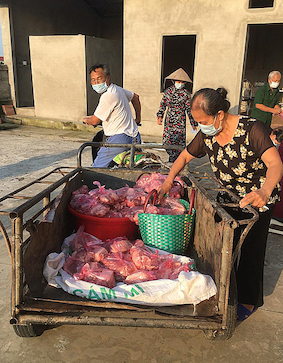 Hai giờ sáng 22/5, nhà văn hoá thôn Giá Sơn, xã Ninh Sơn, huyện Việt Yên lại sáng đèn nhưng không phải để tổ chức cuộc họp bất thường vì dịch Covid-19 như mấy hôm trước. Đêm nay, ba con lợn sẽ được làm thịt để lấy thực phẩm bởi một tuần qua cả làng bị phong tỏa, bữa ăn của nhiều gia đình xuất hiện tình trạng "thiếu chất".