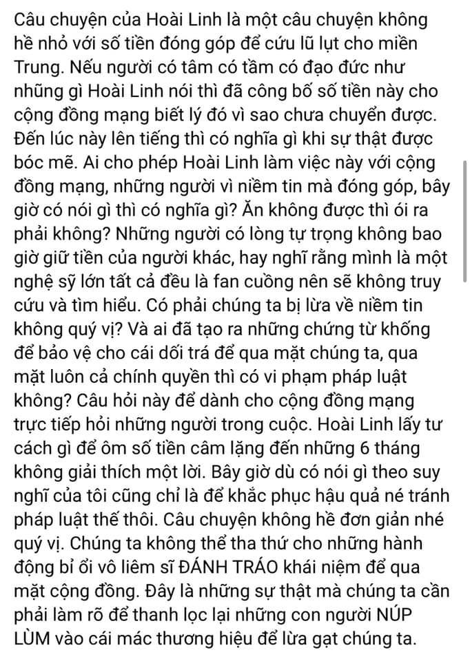 "Không thể tha thứ cho những hành động bỉ ổi vô liêm sỉ đánh tráo khái niệm để qua mặt cộng đồng", lời tâm sự mới đây của bà Phương Hằng sau lời tiết lộ về số tiền từ thiện của Hoài Linh. Vợ ông Dũng "Lò Vôi" cũng khẳng định: "Ăn không được nên ói ra phải không?"...