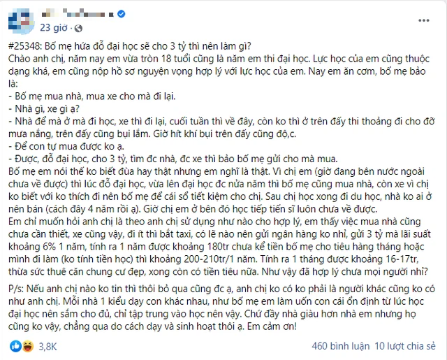 Cụ thể, những ngày gần đây, trên một diễn đàn Confession khá nổi tiếng, bất ngờ xuất hiện một bài đăng gây xôn xao cộng đồng mạng. Theo đó, vấn đề khá “hóc búa” được đặt ra, khi một nam thanh niên đăng đàn hỏi rằng anh chàng nên làm gì nếu như thi đỗ đại học và giật được số tiền thưởng trị giá lên tới 3 tỷ – con số mà có lẽ nhiều người lao động cả đời chưa chắc đã có được.