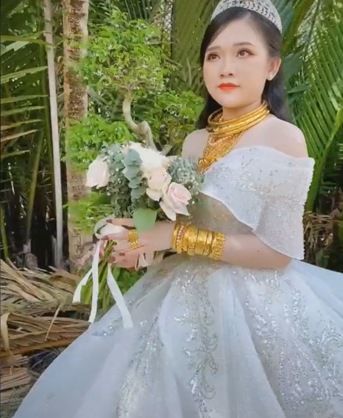 Trong những đoạn clip được đăng tải trên mạng xã hội Tik Tok là hình ảnh cô dâu đeo của hồi môn nặng trĩu tay và cổ. Hình ảnh cô dâu nhỏ nhắn với khuôn mặt rạng rỡ, trên tay và cổ là hàng chục vòng vàng, nhẫn vàng chói lóa khiến ai cũng không dời mắt nhìn.