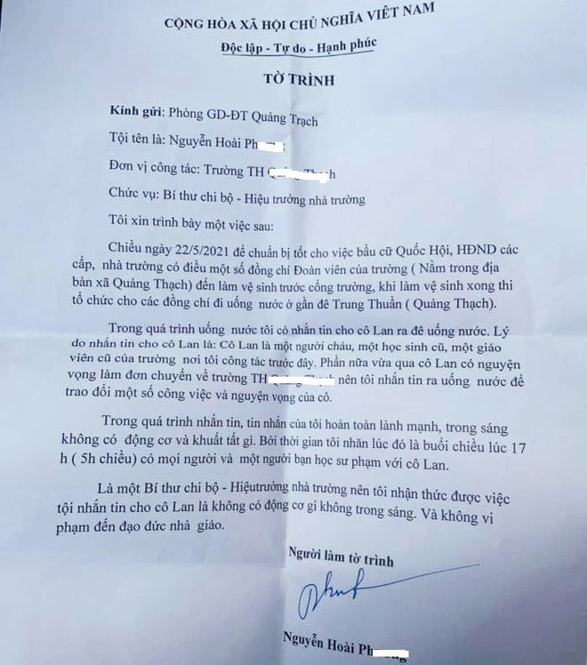Ngày 28/5, chia sẻ với PV Báo **********, ông Phan Thanh Xuân - Trưởng phòng Giáo dục - Đào tạo huyện Quảng Trạch cho biết cơ quan này vừa nhận được bản tường trình của ông Ng.H.Ph. – Hiệu trưởng một trường tiểu học trên địa bàn liên quan đến việc nhắn tin “nhạy cảm” với một nữ giáo viên.