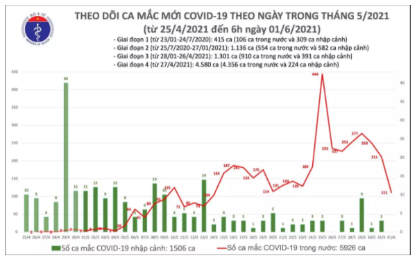 Tính đến 6h ngày 1/6, Việt Nam có tổng cộng 5.926 ca ghi nhận trong nước và 1.506 ca nhập cảnh. Số lượng ca mắc mới tính từ ngày 27/4 đến nay: 4.356 ca.