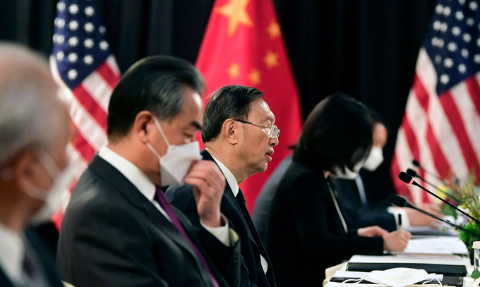 Nhà ngoại giao Dương Khiết Trì (giữa), Ngoại trưởng Vương Nghị và phái đoàn Trung Quốc trong cuộc gặp với các quan chức Mỹ ở Anchorage, Alaska hôm 18/3. Ảnh: AFP.