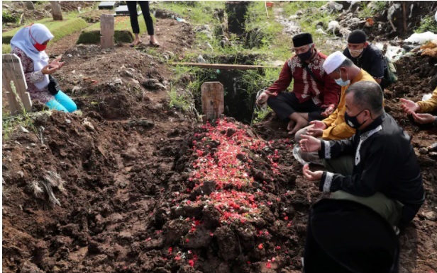 Một gia đình ở Jakarta, Indonesia làm lễ an táng cho người thân tử vong vì COVID-19. Ảnh: AP