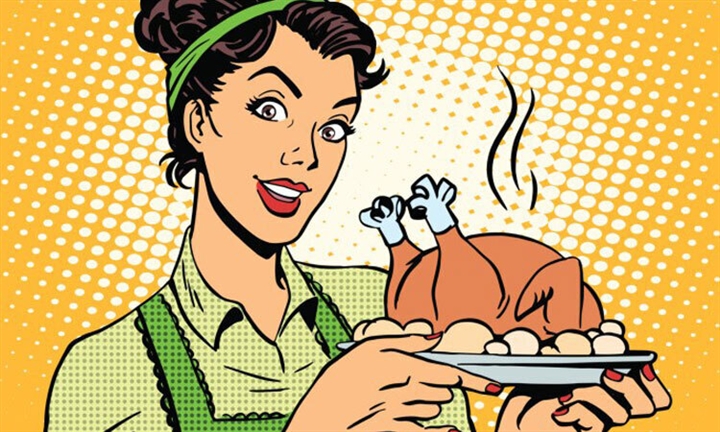 Trong nhà hàng, một bà già đỏm dáng cao giọng gọi: "Cho món gà quay nhé!".