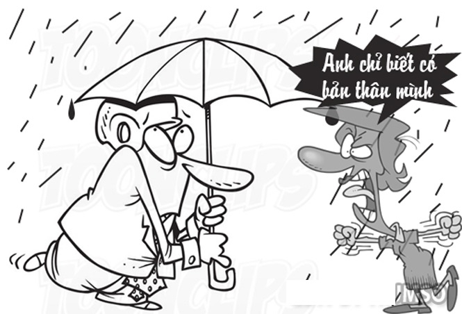 Trời mưa, một cặp vợ chồng đi ngoài phố, người chồng cầm ô nhưng chỉ che cho bản thân.