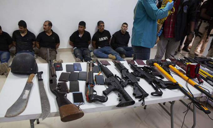 Vũ khí thu giữ từ nhóm nghi phạm vụ ám sát Tổng thống Haiti Jovenel Moise xếp trên bàn tại buổi họp báo ở Port-au-Prince hôm 8/7. Ảnh:AP.