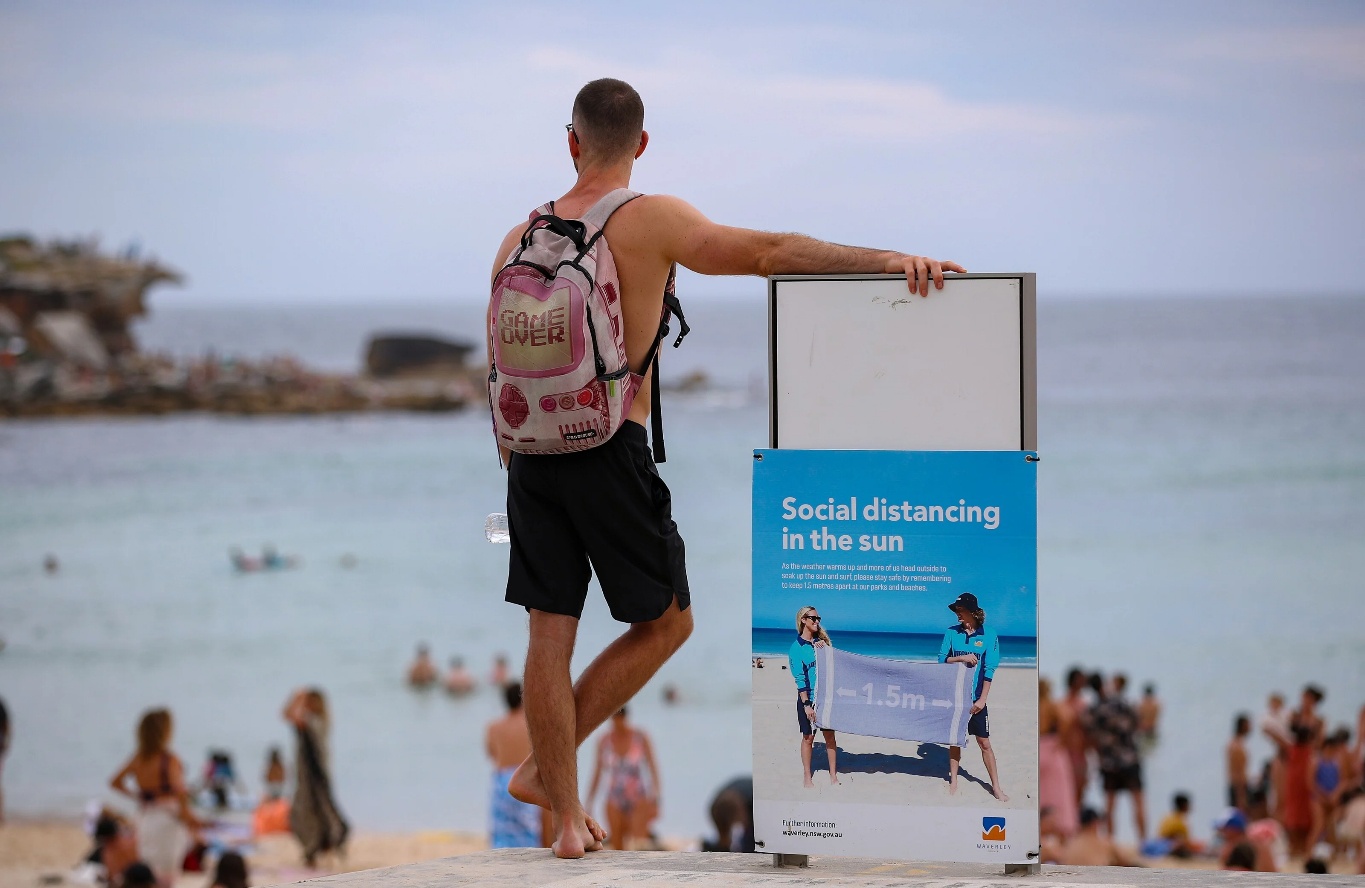 Một người đàn ông đứng bên cạnh biển thông báo giãn cách xã hội tại bãi biển Bondi, Australia vào tháng 1. Ảnh: Tân Hoa Xã.