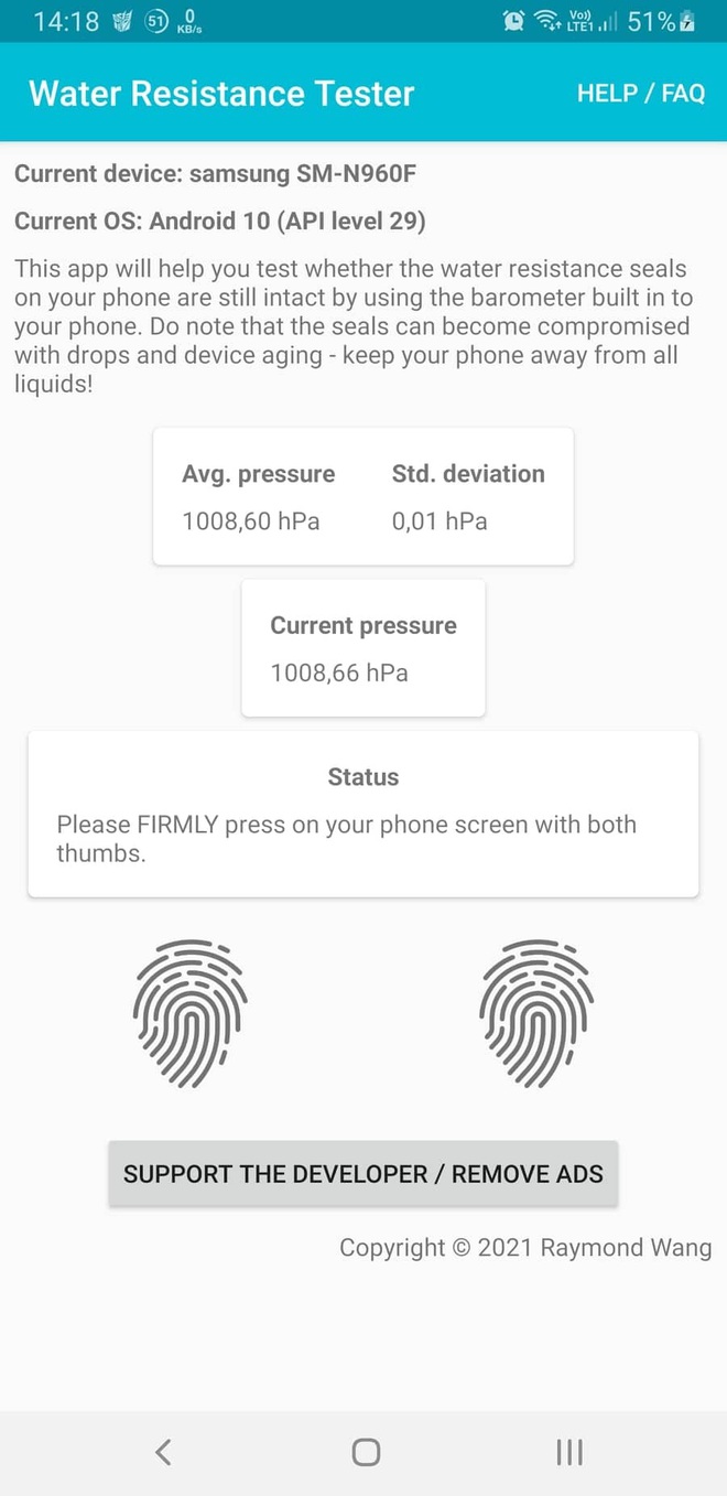 Cách dùng của Water Resistance Tester khá đơn giản. Sau khi cài đặt và kích hoạt ứng dụng, bạn đặt smartphone ổn định trên một bề mặt phẳng, sau đó, sử dụng 2 ngón tay cái đè mạnh lên 2 biểu tượng dấu vân tay trên màn h́nh ứng dụng.