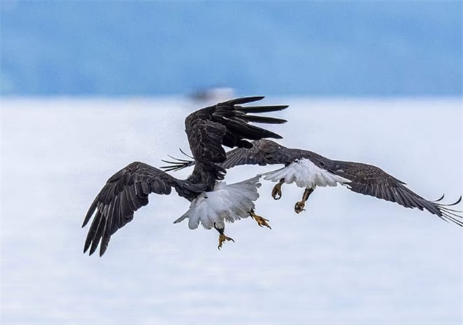 Những bức ảnh cảnh đại bàng hói 'kịch chiến' với đồng loại trên không trung đẹp nao lòng. Trong đó có cảnh con đại bàng hói treo lủng lẳng đối thủ trên không trong cuộc chiến kịch tính với đồng loại.