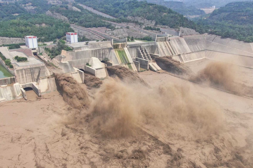Xả lũ tại đập Xiaolangdi ở Lạc Dương, tỉnh Hà Nam, miền Trung Trung Quốc, vào ngày 5/7. Ảnh: AFP.