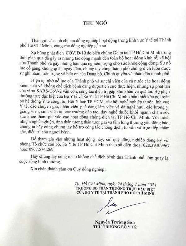 Thứ trưởng Y tế Nguyễn Trường Sơn, Trưởng Bộ phận thường trực đặc biệt của Bộ Y tế tại TP.HCM, ngày 24/7 gửi thư kêu gọi tất cả lực lượng ngành y tham gia chống dịch.