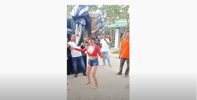 Cô gái có thể đã luyện thành công...thiết đầu công. Đầu của cô gái rất khỏe, có thể chịu được sức nặng của chiếc moto. Ai nấy khi xem clip đều phải trầm trồ thán phục.