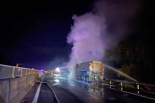 Khi đến Km số 7, tài xế phát hiện khói và lửa bốc ra từ lỗ máy lạnh trên xe nên đã mở cửa thoát thân. Thời điểm này, ngọn lửa nhanh chóng lan rộng và bao trùm cả chiếc xe đầu kéo.