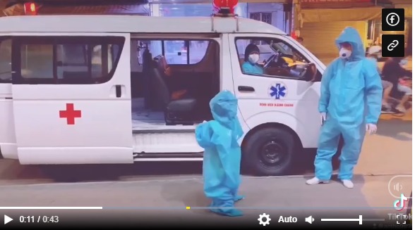 Hình ảnh cho thấy, em bé trong bộ bảo hộ rộng thùng thình bước lững thững đến gần chiếc xe cấp cứu đang đậu dưới lòng đường.
