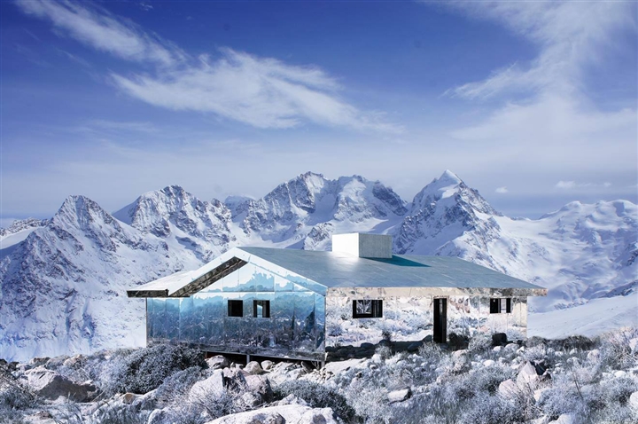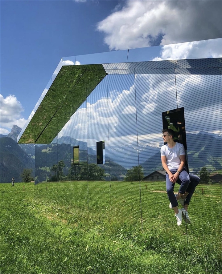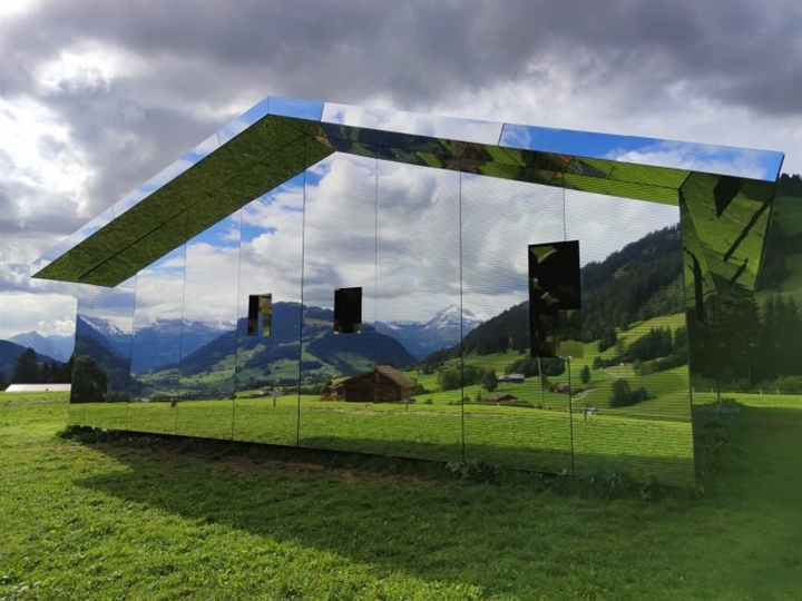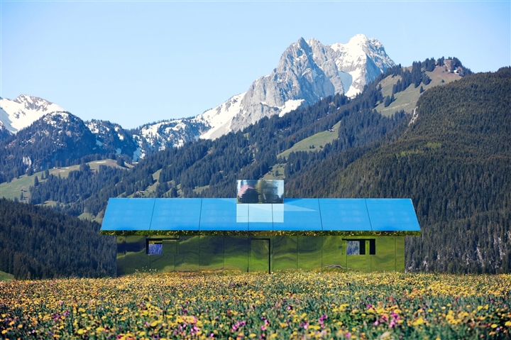 Mirage Gstaad, một tòa nhà phản chiếu được tạo ra bởi nghệ sĩ người Mỹ Doug Aitken, phản ánh cảnh quan chuyển dịch của dãy Alps. Căn nhà trước đây đã được lắp đặt trên sa mạc gần Palm Springs, hiện nằm trên đồng cỏ Alpine phía trên Gstaad, Thụy Sĩ.
