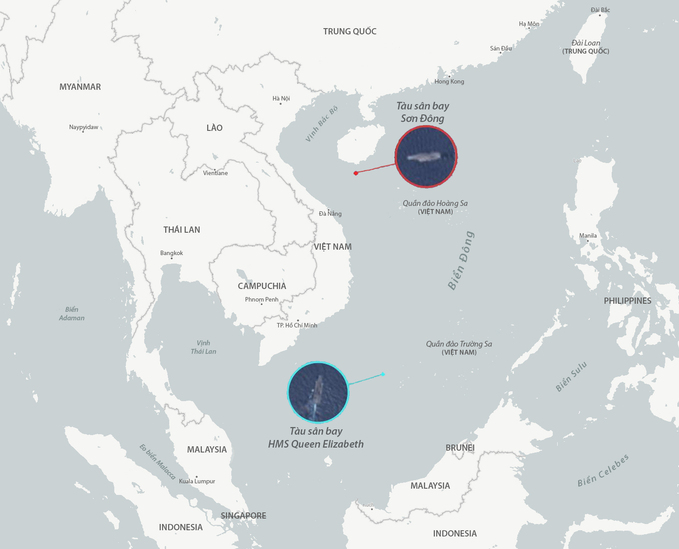 Vị trí được cho là của tàu sân bay HMS Queen Elizabeth của Anh và Sơn Đông của Trung Quốc ngày 28/8. Đồ họa: CSIS, ESA.