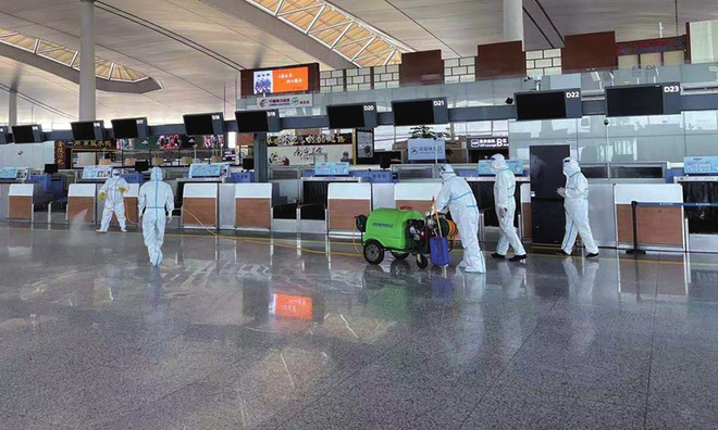 Các nhân viên khử trùng sân bay Lộc Khẩu ở Nam Kinh, Trung Quốc sau khi 17 nhân viên sân bay có kết quả xét nghiệm dương tính (Ảnh: Xinhua).
