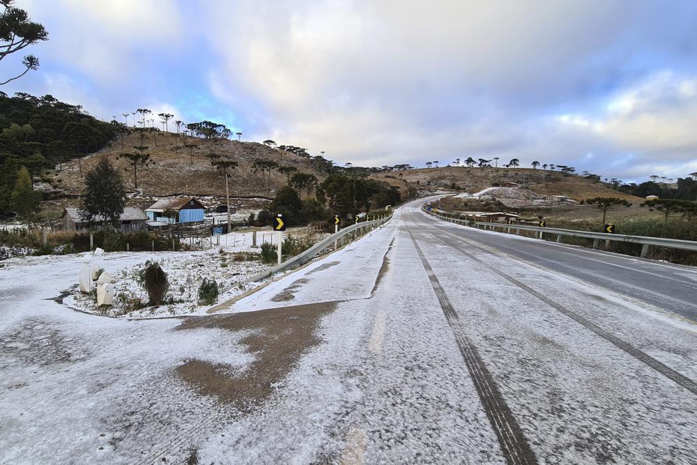 Tuyết phủ trên con đường tại Sao Joaquim vào ngày 29/7. Theo thông tin từ dịch vụ thời tiết Climatempo, ít nhất 43 thành phố tại Brazil thông báo ghi nhận hiện tượng tuyết rơi hoặc mưa băng vào cuối ngày 28/7.
