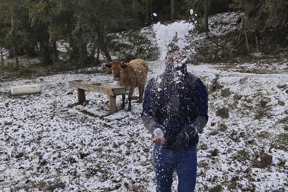 Người đàn ông nghịch tuyết tại một trang trại ở vùng nông thôn của Sao Joaquim ngày 29/7. Trong một đoạn video phát trên kênh truyền h́nh địa phương, người dân tại thành phố Bom Jesus thuộc bang Rio Grande do Sul c̣n dựng người tuyết trên quảng trường và chơi tṛ đánh bóng tuyết.