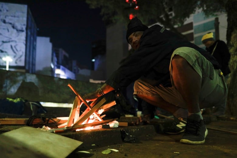 Một người đàn ông sưởi ấm bên đống lửa tại đường phố Sao Paulo.