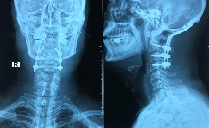 Phim X-quang chụp sau khi bệnh nhân được cố định, làm vững cột sống. Ảnh: Bác sĩ cung cấp.